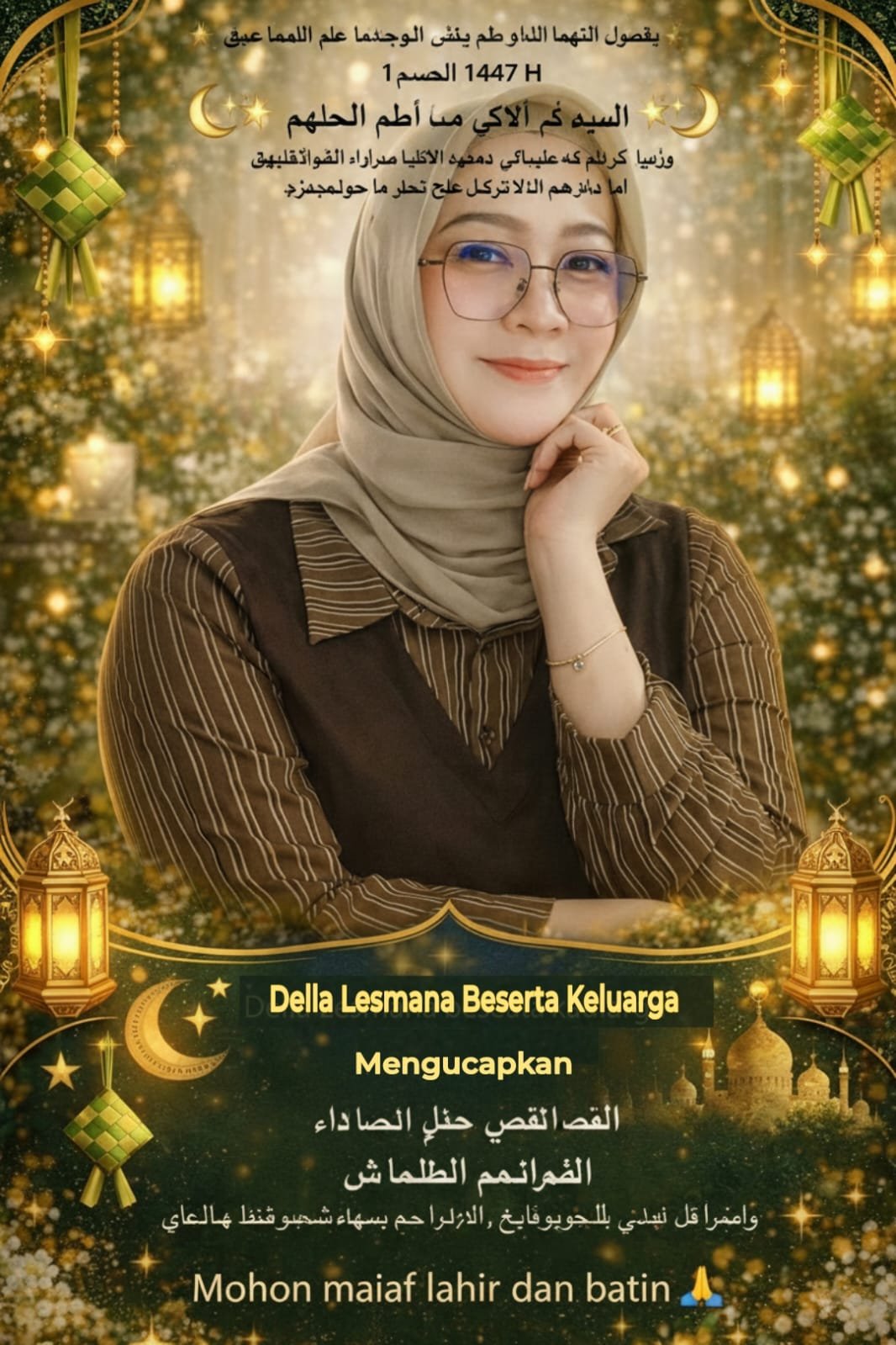 Eid Fitr mubarak lakum wa li-‘a’ilatakum. Nahnu Della Lesmana wa ‘a’ilatuhum nuqaddimu lakum ahrra at-tahani bi munasabat ‘id al-fitr al-mubarak, 1 Syawal 1447 Hijriyah, wa natlubu minkum al-‘afwa ‘an kulla khati’a fi az-zahir wa al-batin.