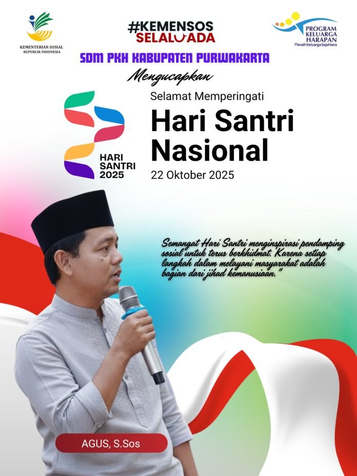 Purwakarta | RadarNusaNewsCom – Dalam momentum Hari Santri Nasional 22 Oktober 2025, Agus, salah satu Sumber Daya Manusia (SDM) Program Keluarga Harapan (PKH) Kabupaten Purwakarta, menyampaikan ucapan selamat sekaligus ajakan reflektif kepada seluruh masyarakat, khususnya para pendamping sosial, agar meneladani nilai-nilai perjuangan dan keikhlasan santri dalam menjalankan tugas pengabdian.