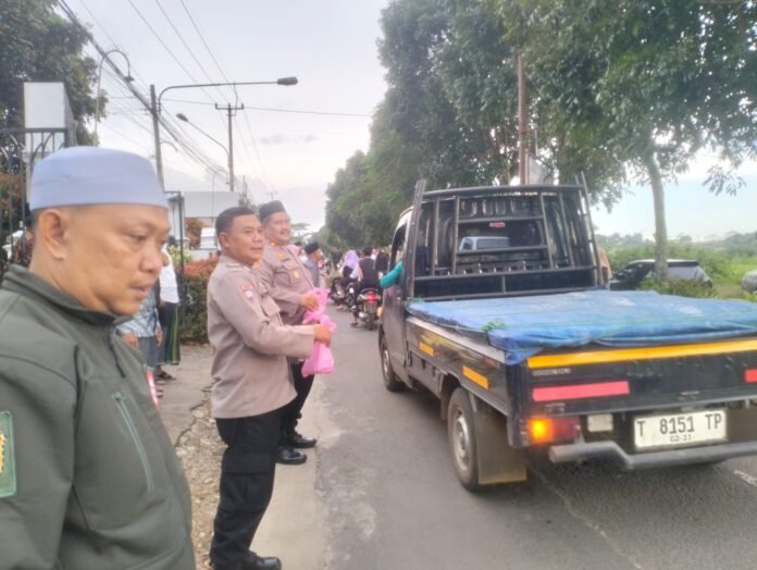 Purwakarta | Radarnusanews.com – Dalam rangka meningkatkan kepedulian sosial di bulan suci Ramadan 1447 H, jajaran Polsek Bojong, Polres Purwakarta menggelar kegiatan aksi sosial dengan membagikan takjil kepada masyarakat, Jumat (13/3/2026). Kegiatan tersebut berlangsung di depan Mako Polsek Bojong, Kecamatan Bojong, Kabupaten Purwakarta.