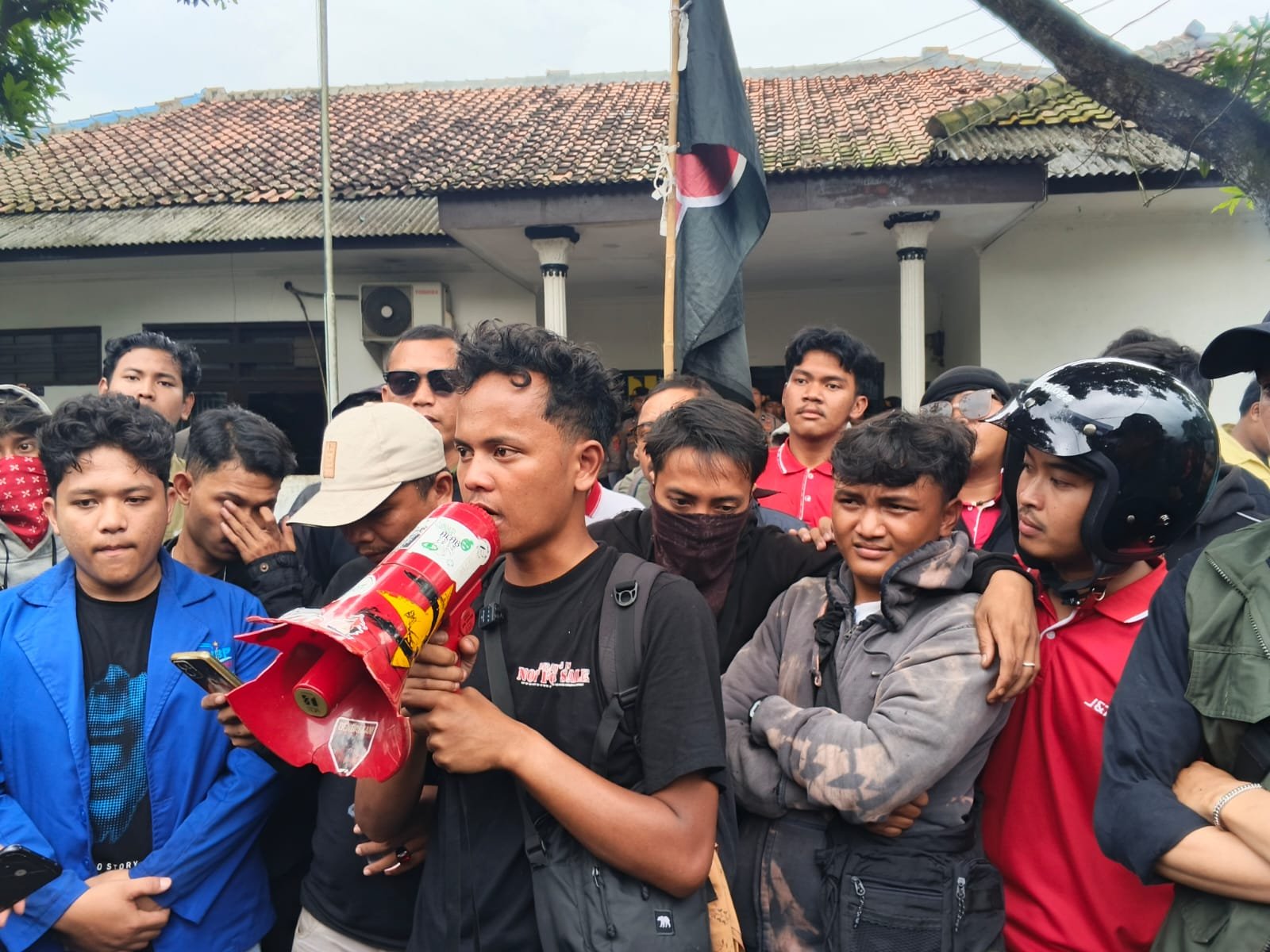 Pantauan di lokasi menunjukkan petugas keamanan kantor hanya melakukan pengawasan dari kejauhan tanpa adanya dialog dengan demonstran.