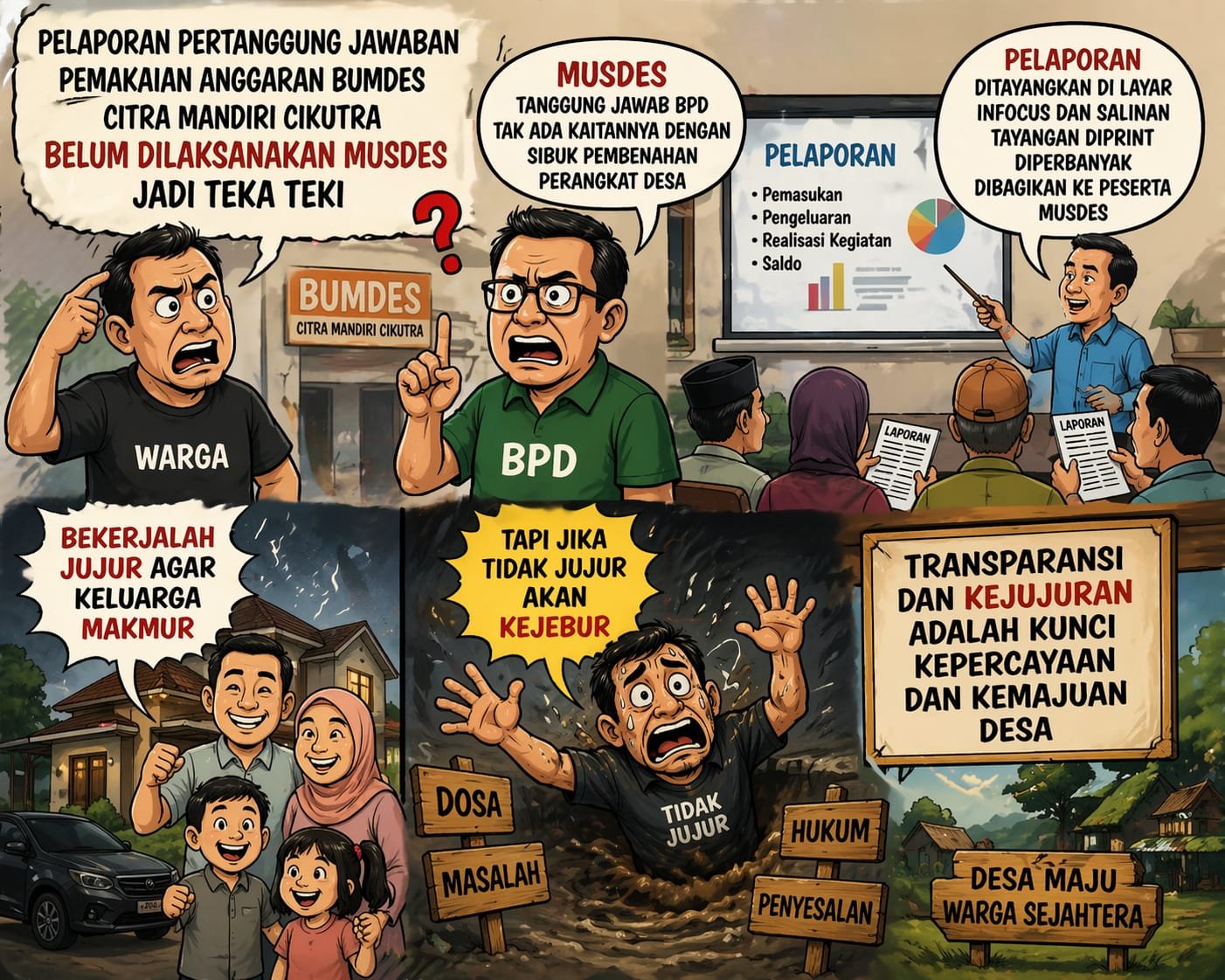 Ketua Bumdes Citra Mandiri Syarifudin mengaku telah ada laporan keuangan di kantor bumdes ” wass, Laporan Keuangan udah ada pak dikantor Bumdes , sudah di infokan ke Pak Lurah dan BPD , dan soal Musdes ranahnya BPD dan Pemdes pak , kita ikutĀ  ” jawabnya singkat saat dikomfirmasiĀ  via Whats App , Rabu 22 April 2026