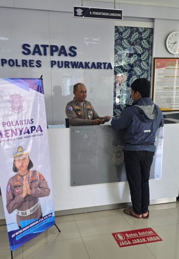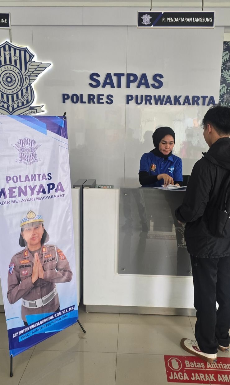 Pantauan di ruang pendaftaran langsung Satpas Polres Purwakarta menunjukkan petugas Satlantas melayani pemohon SIM dengan ramah, sopan, dan penuh kesabaran.