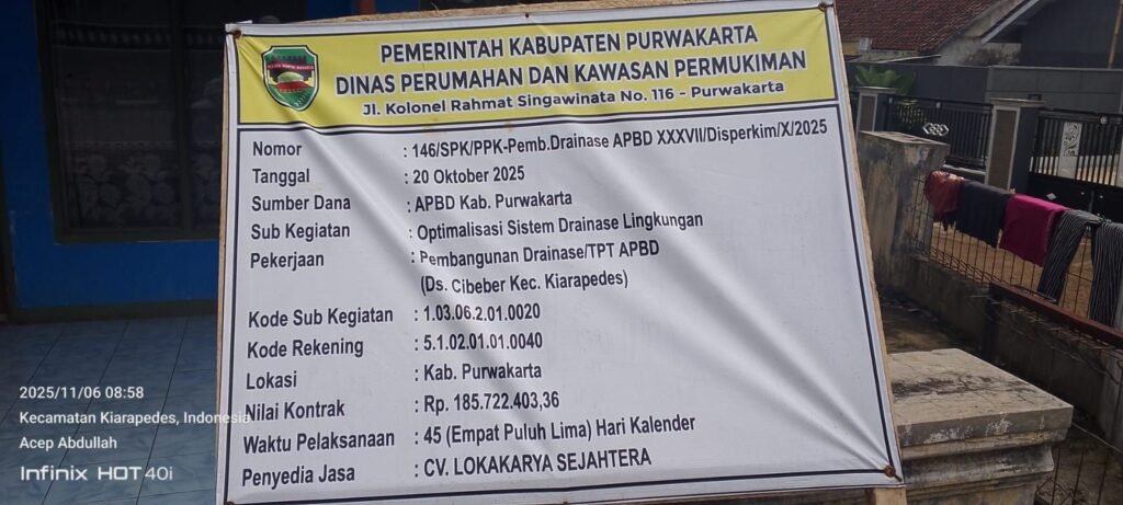 Pembangunan drainase di Desa Cibeber, Kecamatan Kiarapedes, Kabupaten Purwakarta mendapat apresiasi dari masyarakat setempat. Proyek yang bersumber dari APBD Kabupaten Purwakarta Tahun Anggaran 2025 ini dikerjakan oleh CV. Lokakarya Sejahtera di bawah naungan Dinas Perumahan dan Kawasan Permukiman Kabupaten Purwakarta.