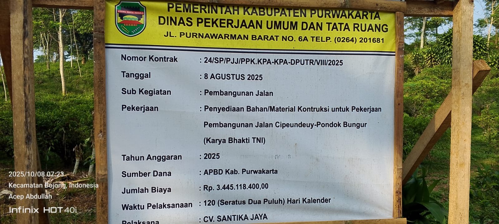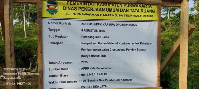 Purwakarta — Pemerintah Kabupaten Purwakarta melalui Dinas Pekerjaan Umum dan Penataan Ruang (PUPR) terus menunjukkan komitmennya dalam meningkatkan infrastruktur jalan di wilayah pedesaan. Salah satu program strategis tahun 2025 adalah pembangunan jalan Cipendey–Pondok Bungur, yang dikerjakan melalui program Karya Bakti TNI dengan dukungan APBD Kabupaten Purwakarta tahun anggaran 2025.
