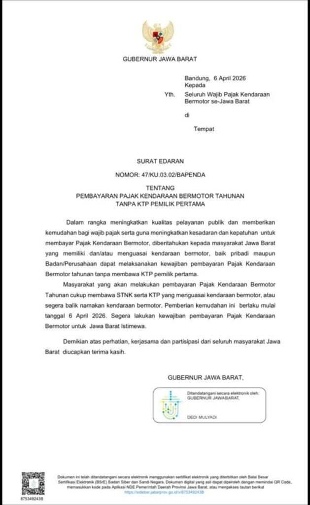 BANDUNG | radarnusanews.com – Pemerintah Provinsi Jawa Barat kembali memberikan kemudahan pelayanan kepada masyarakat. Melalui Surat Edaran Nomor: 47/KU.03.02/BAPENDA tertanggal 6 April 2026, Gubernur Jawa Barat, Dedi Mulyadi, mengeluarkan kebijakan baru mengenai pembayaran Pajak Kendaraan Bermotor Tahunan.