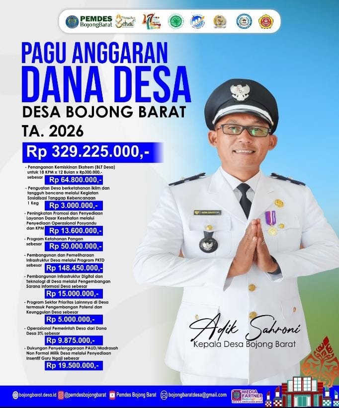 Pemerintah Desa (Pemdes) Bojong Barat secara resmi mengumumkan Pagu Anggaran Dana Desa (DD) Tahun Anggaran 2026 dengan total sebesar Rp 329.225.000. Anggaran tersebut dialokasikan untuk berbagai program prioritas desa yang berfokus pada peningkatan kesejahteraan masyarakat, pembangunan infrastruktur, serta penguatan layanan dasar.