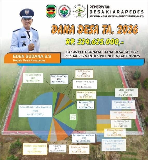 Pemerintah Desa Kiarapedes, Kecamatan Kiarapedes, Kabupaten Purwakarta, resmi mengumumkan besaran Dana Desa (DD) Tahun Anggaran 2026 yang diterima desa sebesar Rp 324.625.000.