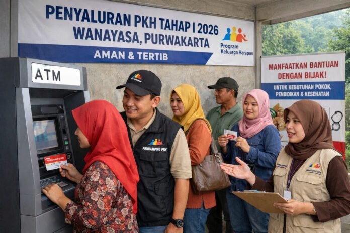 Penyaluran bantuan sosial melalui Program Keluarga Harapan (PKH) Tahap I Tahun 2026 periode Januari–Maret mulai dicairkan pada bulan Februari dan berlangsung kondusif di wilayah Kecamatan Wanayasa, Kabupaten Purwakarta.