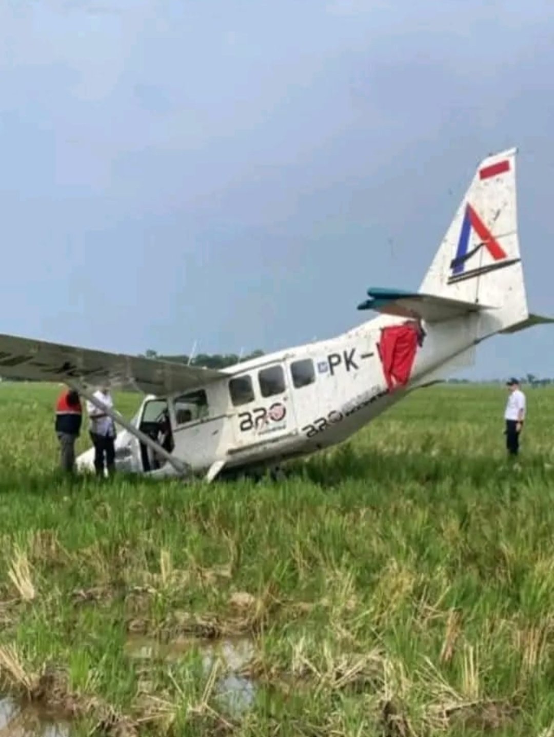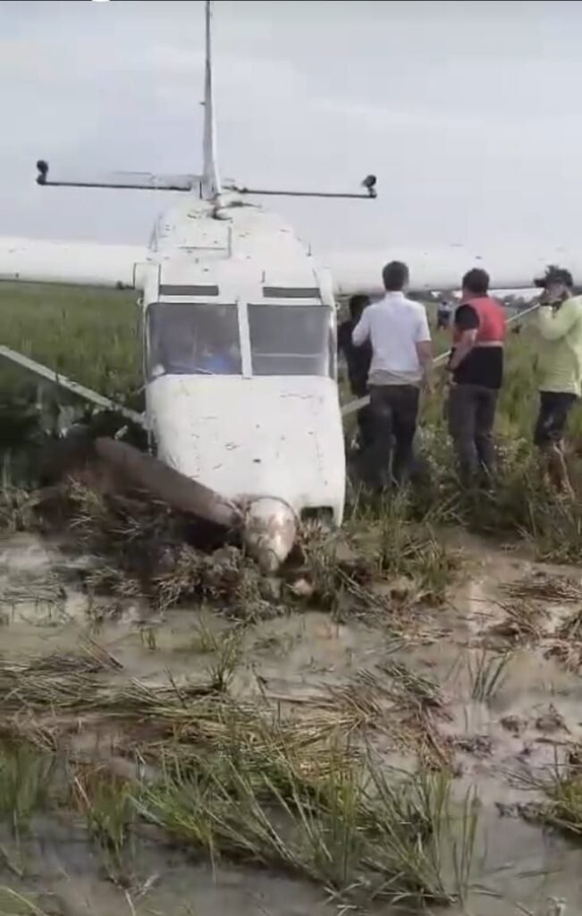 Pesawat tampak mendarat di tengah lahan persawahan yang kondisi tanahnya basah. Sejumlah petugas dan warga langsung menuju lokasi untuk memastikan kondisi kru. Berdasarkan informasi awal di lapangan, tidak ada korban jiwa dalam kejadian tersebut. Pilot dan satu orang pendamping dilaporkan berhasil keluar dari pesawat dalam keadaan selamat.