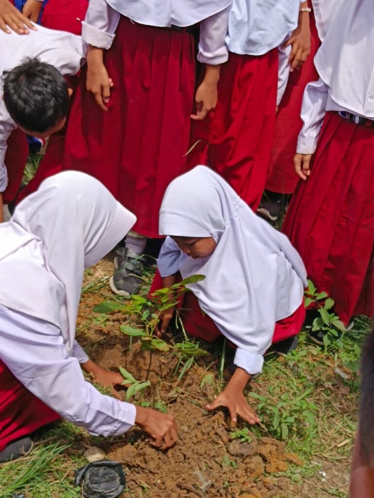 Setelah penyuluhan, kegiatan dilanjutkan dengan penanaman bibit pohon secara simbolis di halaman sekolah. Dua jenis pohon yang ditanam yakni pohon durian dan pohon matoa, yang memiliki nilai ekologis dan ekonomi tinggi. Penanaman dilakukan bersama oleh Kanit Binmas, Bhabinkamtibmas, Kepala Sekolah, serta sejumlah guru dan perwakilan siswa.