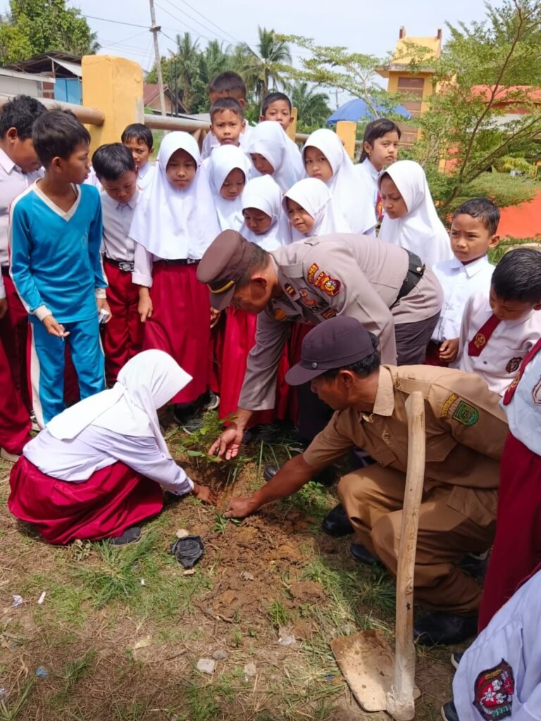 Polsek Kemuning Tanam Pohon Serentak dan Edukasi Cinta Lingkungan di SDN 012 Keritang Hulu, Wujudkan Green Policing Polda Riau