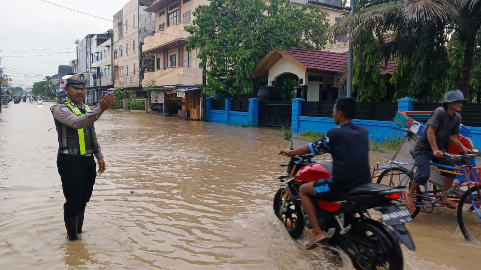 Sat Lantas Polres Inhil Lakukan Pengaturan Lalu Lintas di Titik Rawan Air Pasang Surut Tembilahan