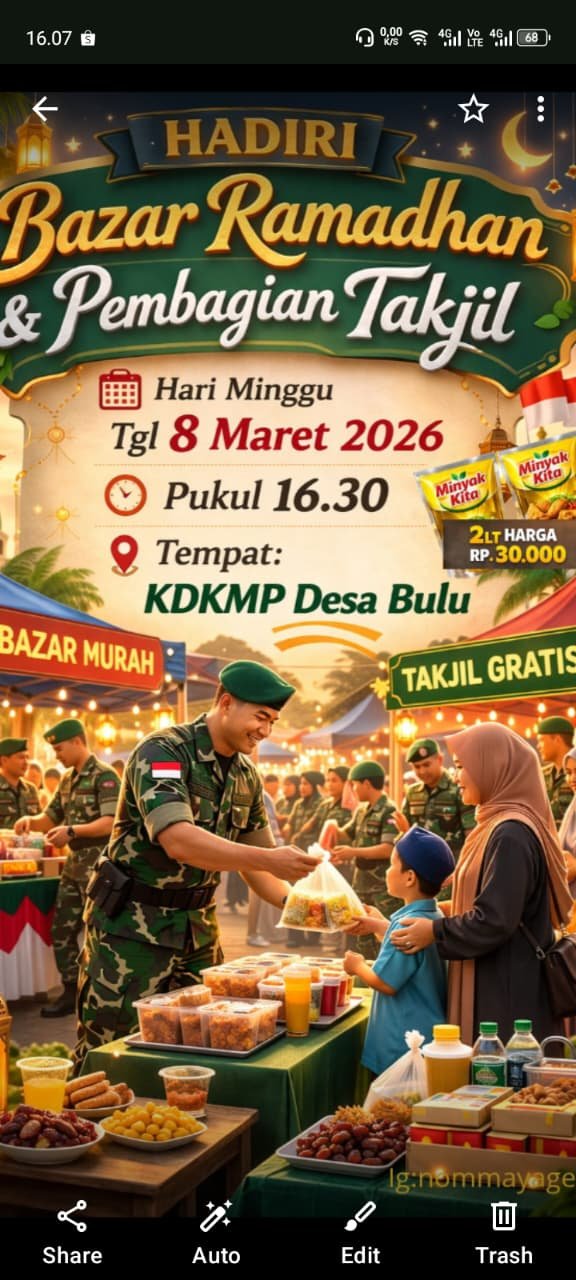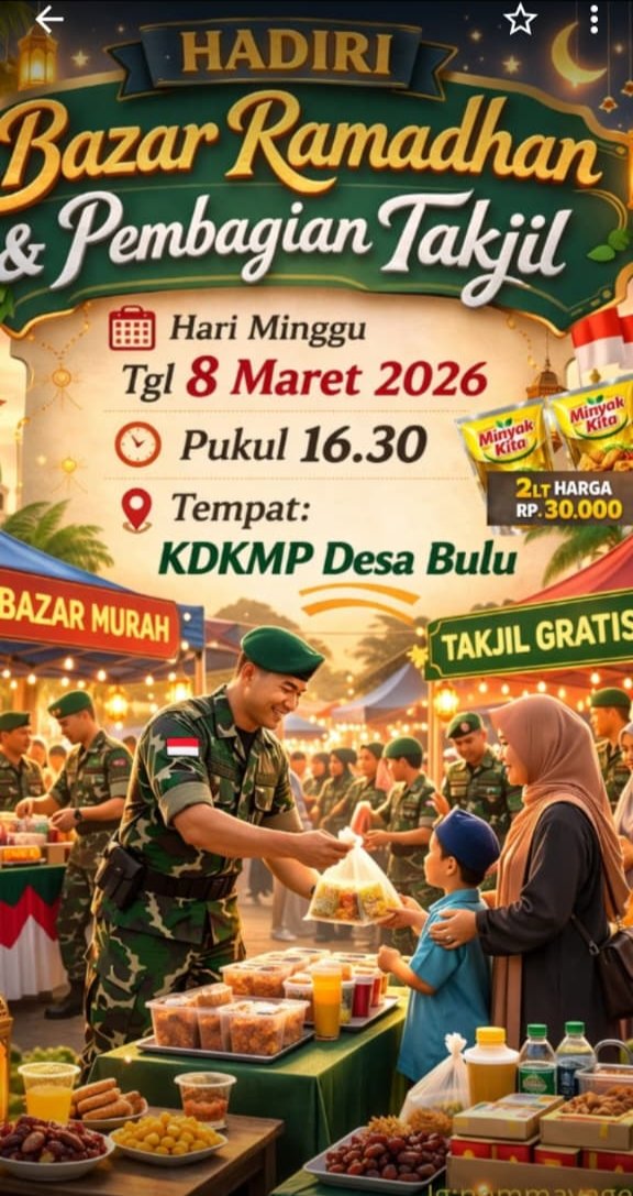 Dengan adanya bazar Ramadhan dan pembagian takjil gratis ini, warga Desa Bulu dan sekitarnya diharapkan dapat hadir dan meramaikan kegiatan yang sarat nilai sosial dan kebersamaan tersebut. Acara ini diperkirakan akan menjadi salah satu agenda Ramadhan yang dinantikan masyarakat di Kecamatan Sugihwaras. ( Redaksi )