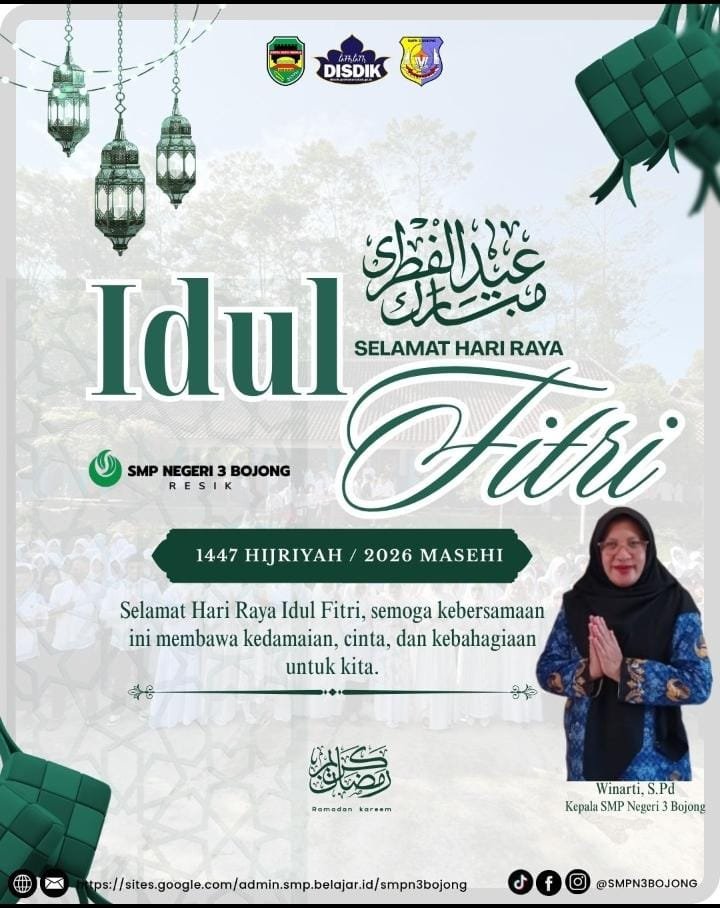 Purwakarta | Radarnusanews.com – Dalam rangka menyambut Hari Raya Idul Fitri 1447 Hijriyah / 2026 Masehi, keluarga besar SMP Negeri 3 Bojong menyampaikan ucapan selamat kepada seluruh masyarakat, khususnya di lingkungan pendidikan.