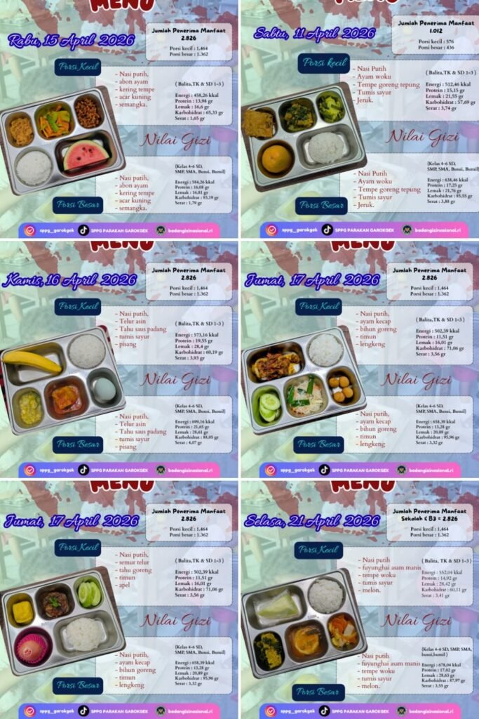 Seluruh penyusunan menu tetap mengacu pada standar gizi seimbang dari Badan Gizi Nasional, sehingga kebutuhan vitamin, serat, dan energi bagi anak-anak serta kelompok penerima lainnya dapat terpenuhi dengan baik.