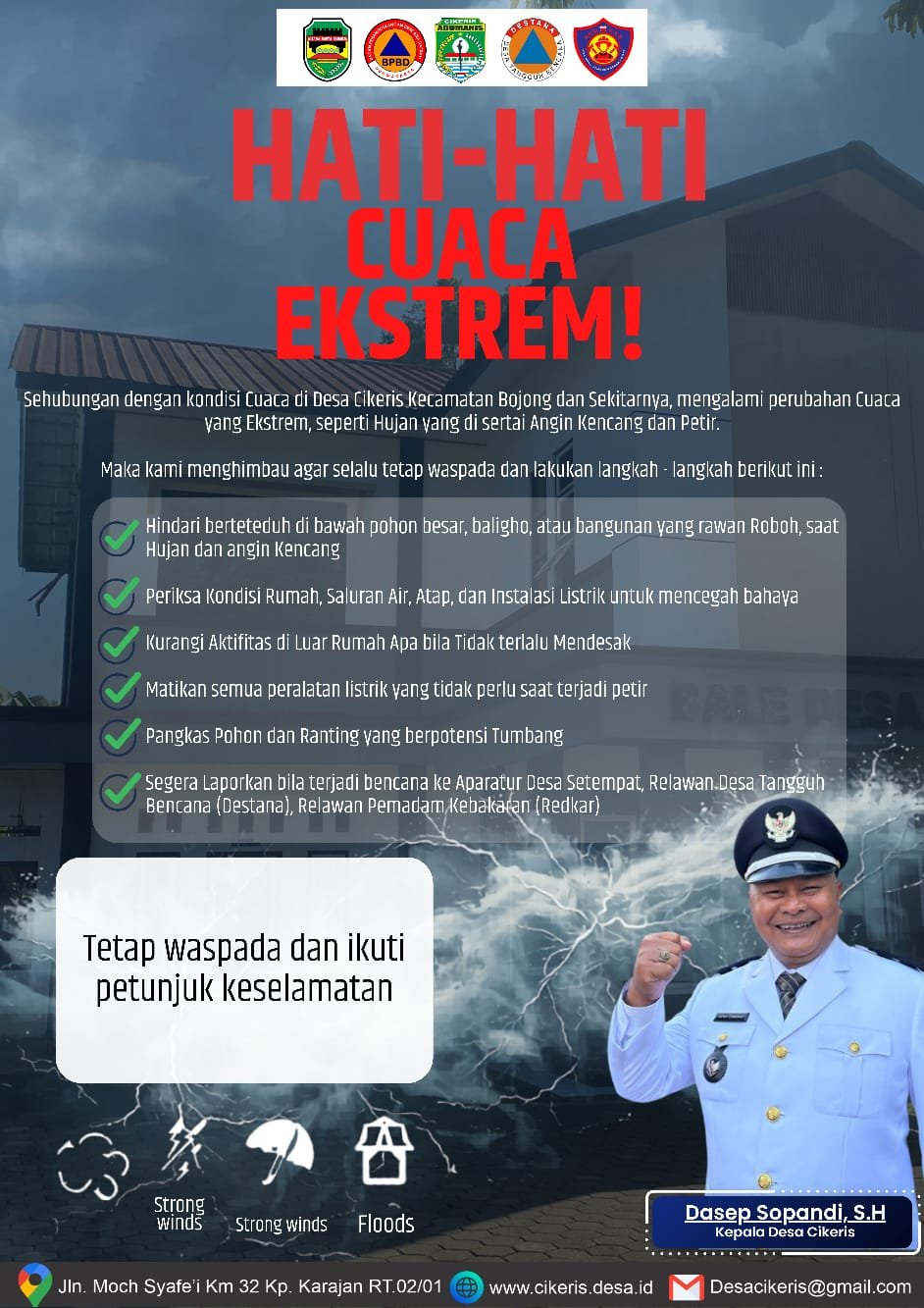 Kepala Desa Cikeris, Dasep Sopandi, S.H., mengingatkan warga agar lebih berhati-hati dalam beraktivitas, terutama saat kondisi cuaca memburuk. Ia menegaskan bahwa keselamatan masyarakat menjadi prioritas utama di tengah potensi bencana yang bisa terjadi sewaktu-waktu.